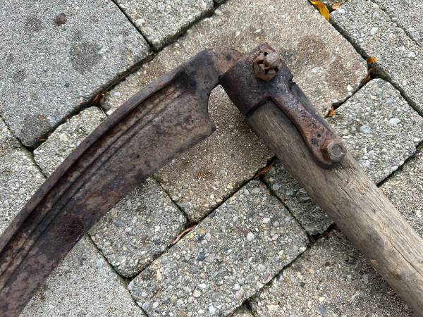 Vintage Antique Scythe Hay Sickle Grim Reaper Farm Tool Implement Curved blade is completely intact. Missing the wood portion of one handle. Display as is or restore.