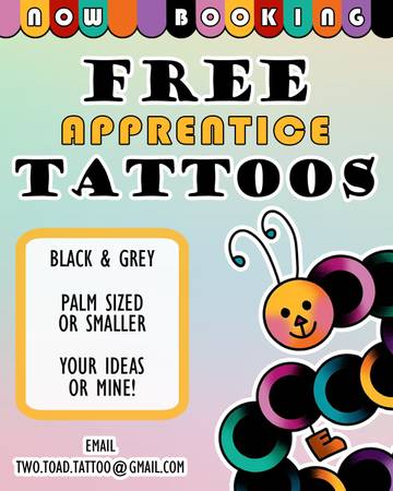 My name is Emy and I am a tattoo apprentice who has just started tattooing on real skin, and I am looking to offer free tattoos to get some practice in and pictures for my portfolio. I work at a studio near downtown Waukesha. All races, genders, body types, and sexualities are welcome, and hate will not be tolerated.