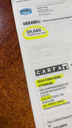 This 2016 Ford Edge TITANIUM looks great, drives as great as it looks (you’ll believe it when you drive it) is loaded with equipment (Sony sound system, APPLE CARPLAY, heated leather, push button start, power tailgate, and much more), is ALL WHEEL DRIVE with the UPGRADED V6 engine, has had only two owners (first a rental vehicle for 7 months in the states of TEXAS and Pennsylvania, then was a personal vehicle for the last 9 years in the states of FLORIDA and Maryland)… has NEVER seen a harsh Wisconsin winter!….this is a QUALITY well taken care of Ford…I have a FULL CARFAX report…it's not perfect, it's not brand new, there are some imperfections, but it is very nice