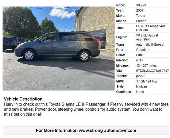 Hurry in to check out this Toyota Sienna LE 8-Passenger !! Freshly serviced with 4 new tires and new brakes, Power door, steering wheel controls for audio system. You don't want to miss out on this...