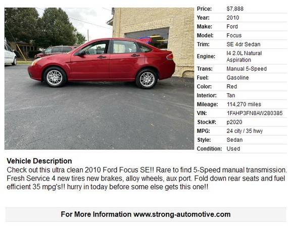 Check out this ultra clean 2010 Ford Focus SE!! Rare to find 5-Speed manual transmission. Fresh Service 4 new tires new brakes, alloy wheels, aux port. Fold down rear seats and fuel efficient 35 mpg's!! hurry in today before some else gets this one!!