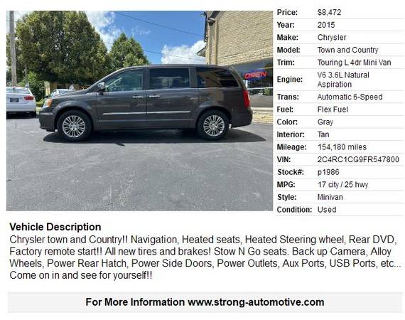 Chrysler town and Country!! Navigation, Heated seats, Heated Steering wheel, Rear DVD, Factory remote start!! All new tires and brakes! Stow N Go seats. Back up Camera, Alloy Wheels, Power Rear Hatch, Power Side Doors, Power Outlets, Aux Ports, USB Ports, etc... Come on in and see for yourself!!