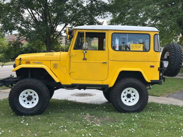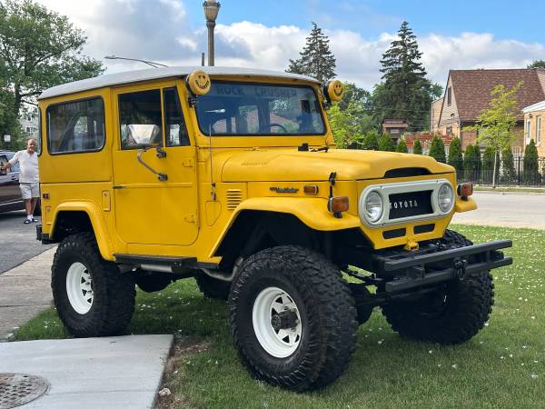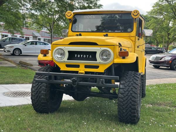 1972 Toyota, Land Cruiser FJ 40, 4X4 power by a small black GM 350 built, headers and custom exhaust, 650 double pump carburetor high-rise manifold. Four-Speed manual transmission. Lifted, sitting on brand new tires and wheels as well as the spare. All gauges dual fuel tanks all working properly. Finished in a yellow rhino guard paint. This FJ cruiser is a beast will go through anything climb anything.. Also, Cruise is great on the street. Car spent its life in Arizona. There is no rust whatsoever underneath is beautiful. Everything is in working order, we were supposed to ship the car out of the country to Costa Rica so everything has been serviced and ready to go, but the country changed the rules and want something 20 years or newer. Car was purchased out of Arizona is only spent the last year here. Please call or text me with any questions at show contact info