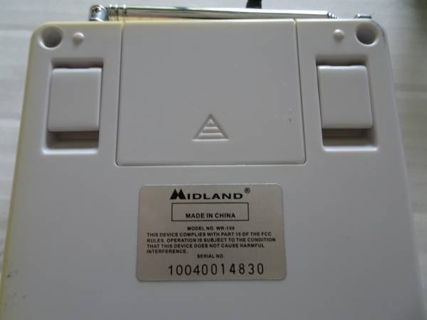 MIDLAND All Hazards Weather Alert Radio WR - 100 Midland WR-100 All Hazards NOAA Storm Warning Radio. Approx. 2.5in. screen size. White. Model number WR100. Includes: Radio Power Cord Manual Quick...