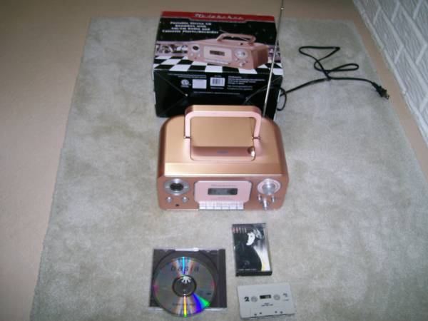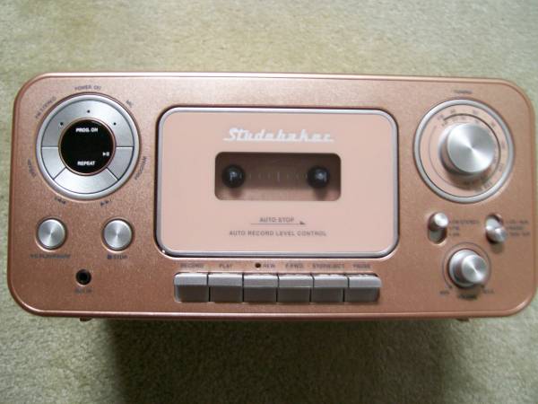 BRAND NEW IN BOX WITH ALL PACKAGING - "STUDEBAKER SB2135RG" ROSE/GOLD COLORED BOOM BOX. FEATURES: STEREO-FM AND AM RADIO / STEREO-TOP LOAD CD, CD-R, CD-RW, PLAYER / STEREO-FRONT LOAD CASSETTE PLAYER {With Auto Stop}, AND RECORDER WITH BUILT-IN CONDENSER MICROPHONE / ROTARY TELESCOPIC ANTENNA / FOLDABLE HANDLE / AUXILLARY INPUT JACK FOR CONNECTING IPOD, MP3, CELL PHONES, ETC. / PROGRAMMABLE CD TRACKS / SIDE MOUNT STEREO SPEAKERS / EITHER 120 VOLT AC POWER CORD {Included] OR SIX "C" BATTERIES / RICH SOUND. $69.00.