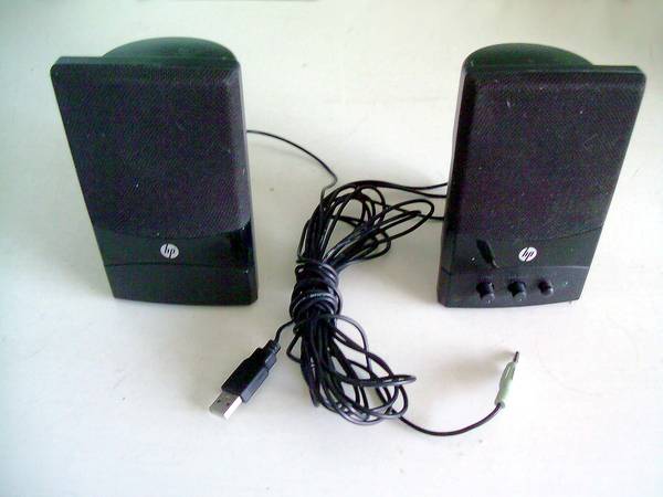 --- Hewlett-Packard model UC-236. These black Hewlett-Packard USB-powered multimedia stereo speakers (model No. UC-236) are in good working order. They receive their power input via a USB port connector. Their stereo input is from a standard 3mm audio jack. (photo #2)