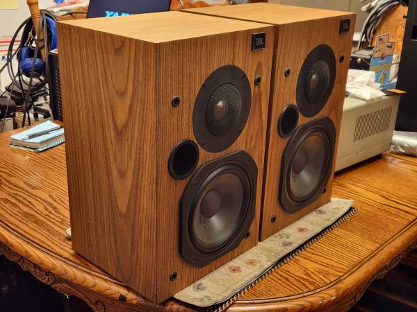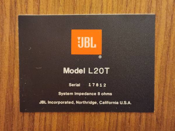 Best sounding speaker of this size the JBL L20T sure shines with any type of music. These are 100% original and include the O35Ti Tweeters and cast aluminum 115H-1 woofers with Butyl Rubber surround. Sequential Serial Number Pair with matching teak veneer look wonderful. Frequency Response is 45Hz-27,000Hz with a Power Rating of 100 Watts Continuous RMS. Impedance is 8 Ohms and size is 14.75H×9.5W×8.25″D. Sorry no grills, who would want to cover these beauties anyway. I will demo prior to purchase. Thanks.