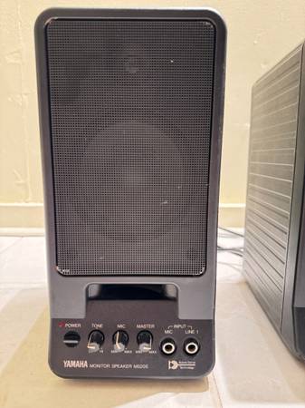 Potent vintage Japanese powered speaker set with RCA inputs and heavy duty wall mounts included. Price is for the complete set.