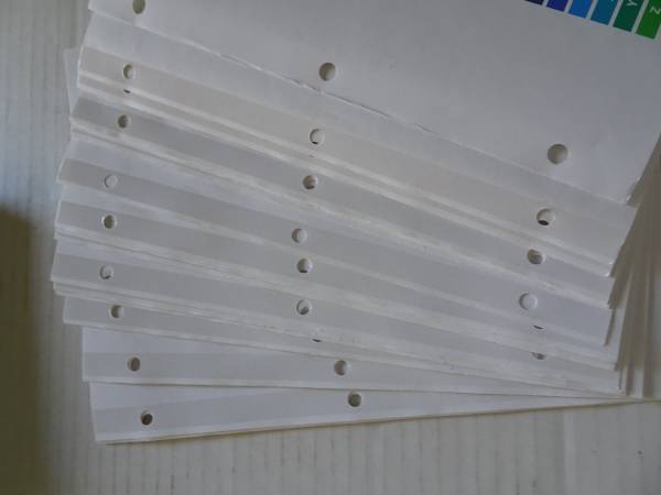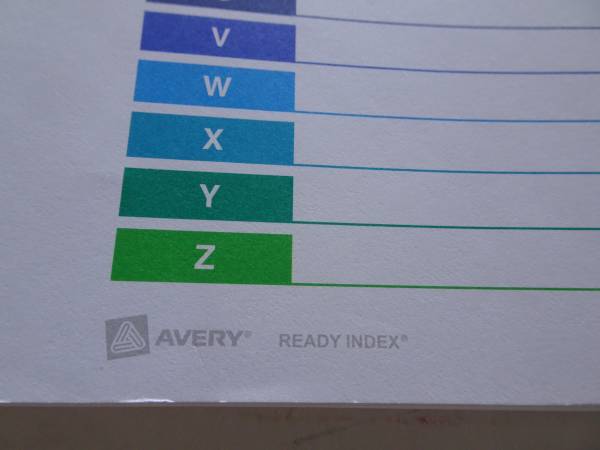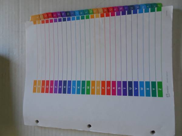 Multi colored alphabetic tab page dividers for 3 ring binders (Avery Ready Index) They have been used and the top page with the color index has a smudge but the rest are in excellent condition. All holes are still intact. 27 sheets total.