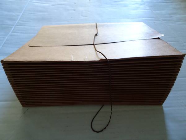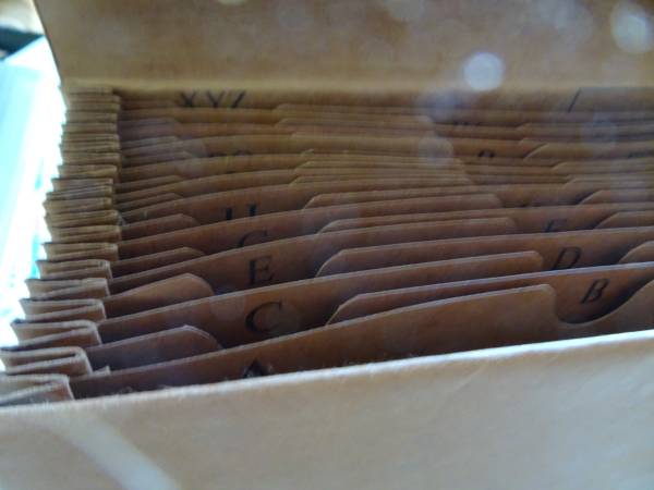 Brown expandable alphabetical file folder (Wilson Jones Cookie & Cobs Division Favorite “Kraftall” File No. B-1817-AE) Letter size. This has been used and does have some wear. The elastic security cord is stretched out but still intact. There are no holes or rips, just wear along some of the edges.