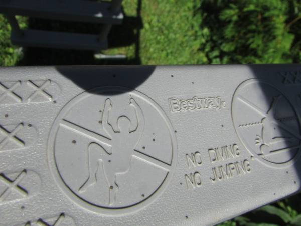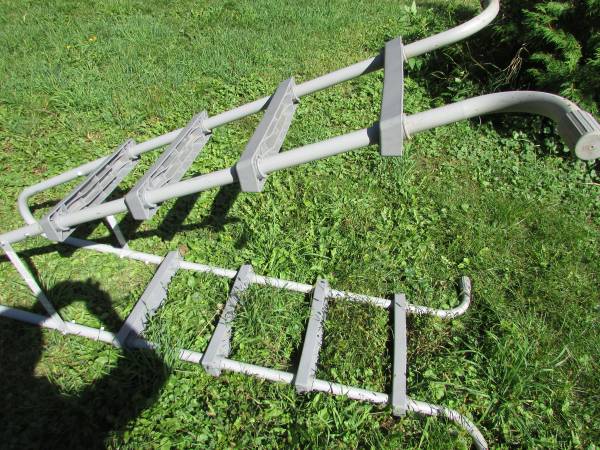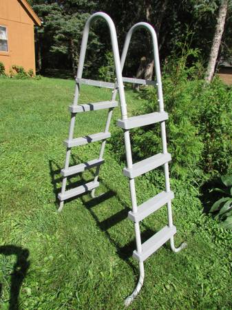 Above ground aluminum frame swimming pool ladder. Height up to cross bar is 49". Has 4 steps.