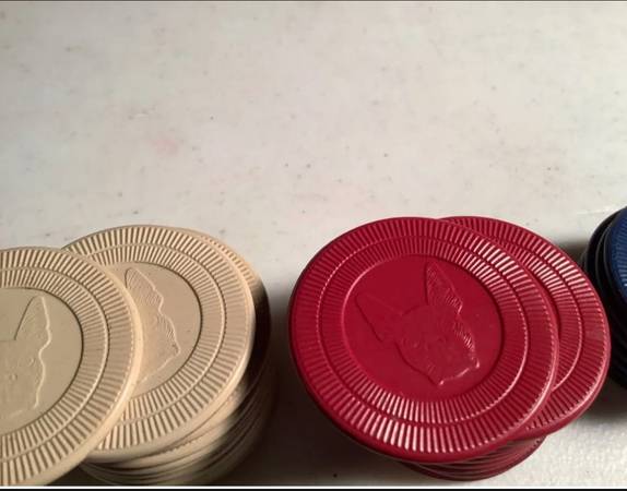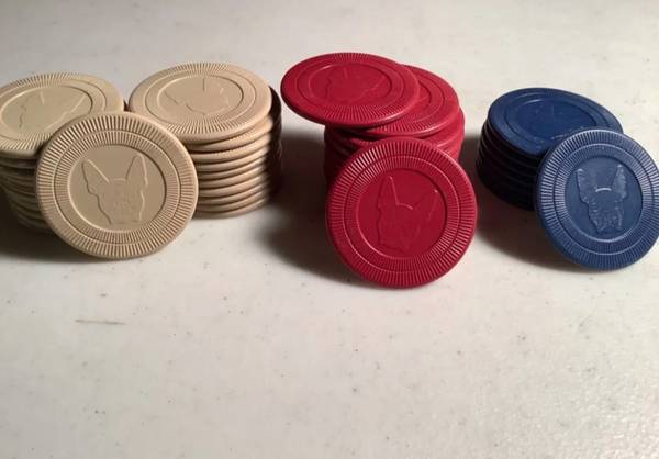 Set of 40 Vintage interlocking Clay composite poker chips have an embossed Boston Terrier French Bull dog face on Poker Chips - Collectible. 21 White, 11 Red, 8 Blue, 1 Extra Red Vintage Composite...