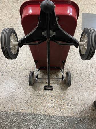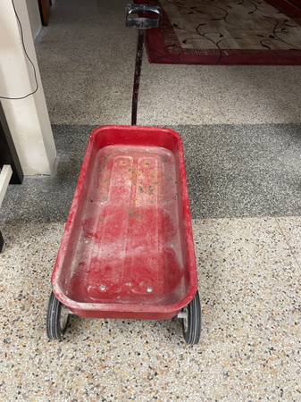 Classic Red Radio Flyer Metal Wagon, some surface cosmetic rust not rusted thru can be painted. Wheels work normal . Habla Español Vagón de metal Halloween trick-or-treatingpumpkin Farmhouse garden...