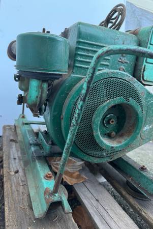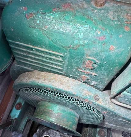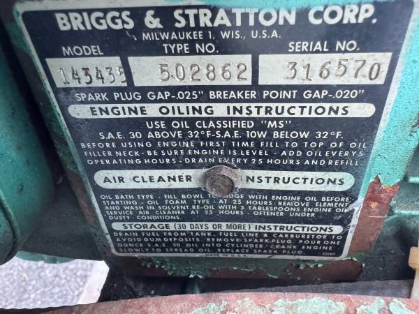 YES, IT LOOKS ROUGH; BUT IT RUNS FINE. The cheap overspray paint is flaking off in a lotta places. . . BUT UNDERNEATH THAT “quick sprayed green paint” is the original “Briggs” Diamond logo, “B” and “S” are stamped into the front flywheel guard (check the photos carefully). . . the serial # on the Alternator is G65. A very low number. This may be a collector’s item.