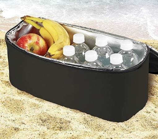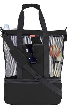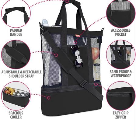 versatile beach bag / picnic bag with pockets, long and short strap/ handles, cooler in base. used only once. 16” x 20” x 6”