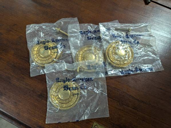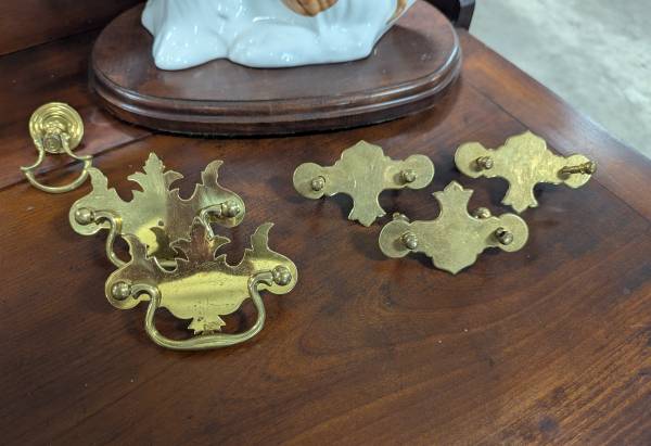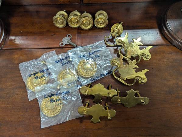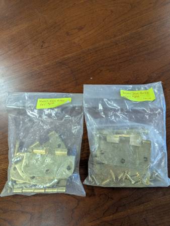 Perfect for restoration of old furniture and wood working projects. Assorted drawer pulls, escutcheons, knobs, antique screws. Brass hinges. Brass door knob. Brass sitch plates. Check out the bin of small pieces. A treasure trove whether building or repairing.