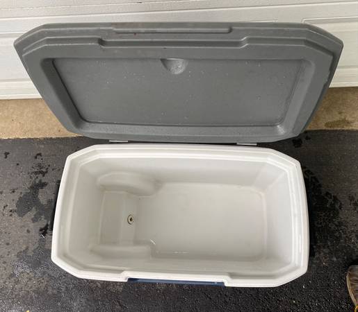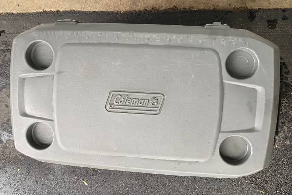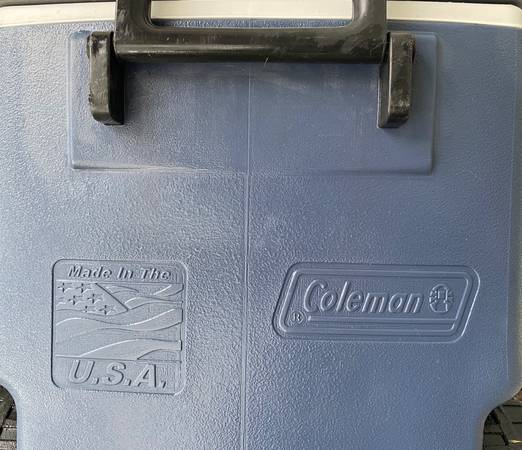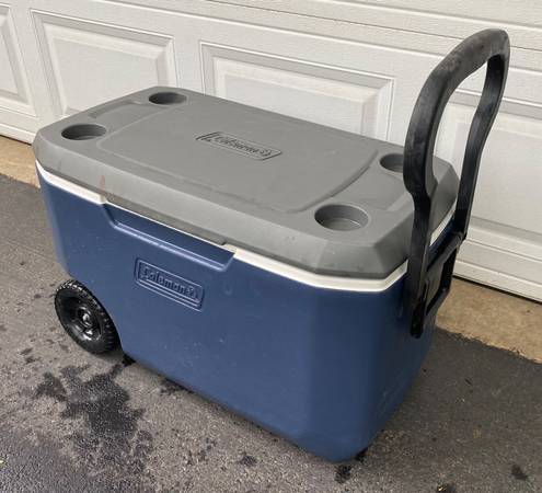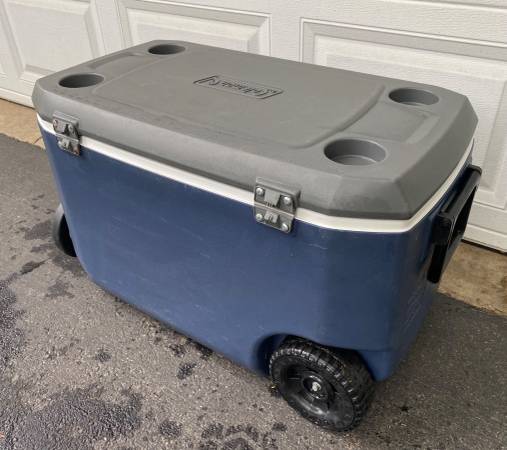 A Coleman 316 Series Wheeled Cooler 101 cans/62 qt. Hard-Sided Cooler, in gently used condition. See the pic that lists all of the built-in features that this cooler includes. Made in USA. $40.