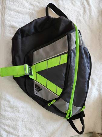 Adidas one-shoulder backpack has two spacious main compartments and a front flap pocket. Ripstop material with reflective detail. Adjustable shoulder strap.