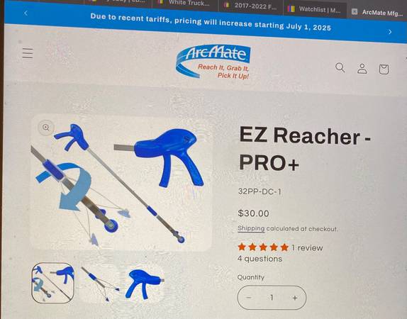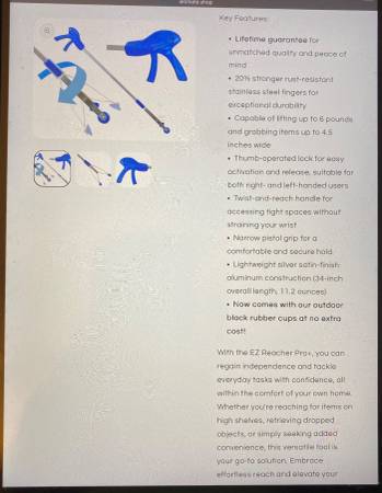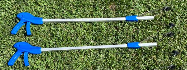EZ Reacher - Pro+ Commercial Reacher Tools. 32” length. USA Made, with a Lifetime Warranty. It has a thumb-operated lock feature. Made with a silver satin-finish aluminum frame, and stainless steel fingers. Can be used indoors or outdoors. $30. ea., plus tax & shipping cost. from the manufacturer. Mine are $18. ea.