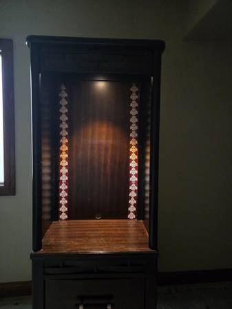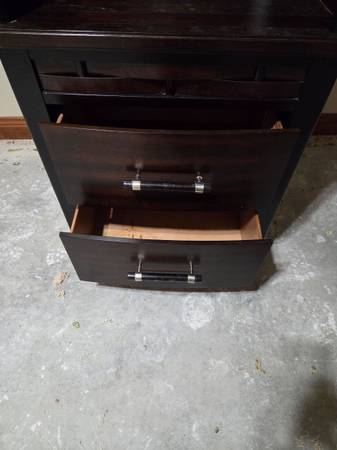 Bob's discount furniture. Hardwood constructed with 2 tone cherry and espresso veneer finish. Excellent as an entertainment unit, display cabinet, or bookshelf. Comes with large open shelf and 2...