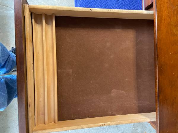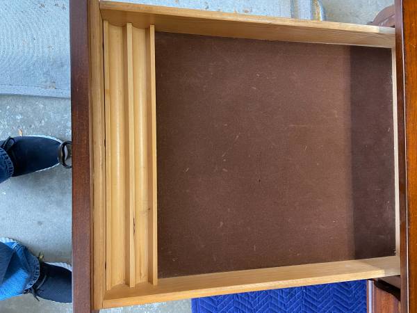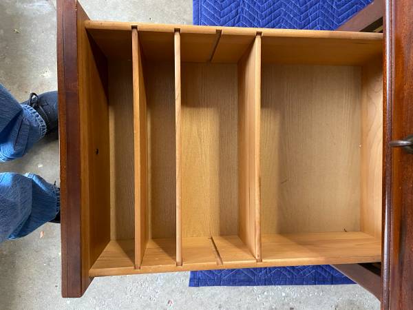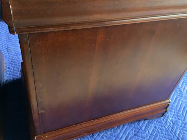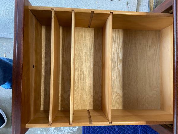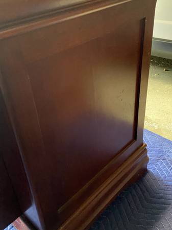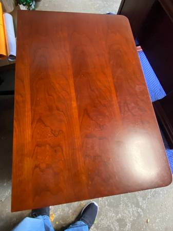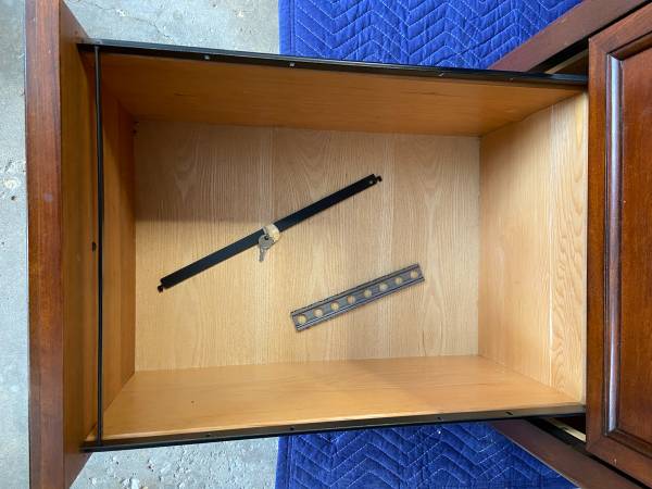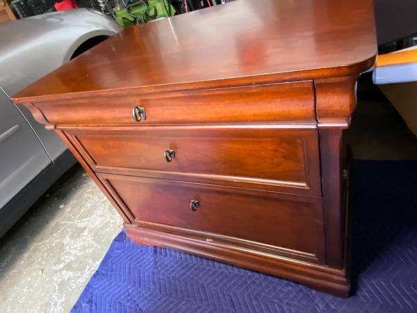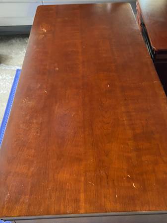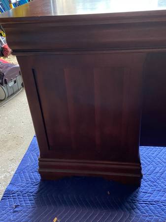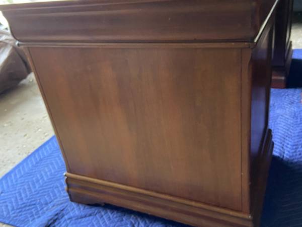 Beautiful, solid, and substantial home office desk and matching file cabinet in good condition (see pictures). Drawers are dovetail construction, clean, and in good working order. Finished back of desk means it can be placed in middle of room. Just needs a simple top refinish (sand and stain) and center drawer pulls. Matching file cabinet top is in very good condition. Hard to find quality-built home office furniture like this at this price. Must be able to pick up (will help load on vehicle).