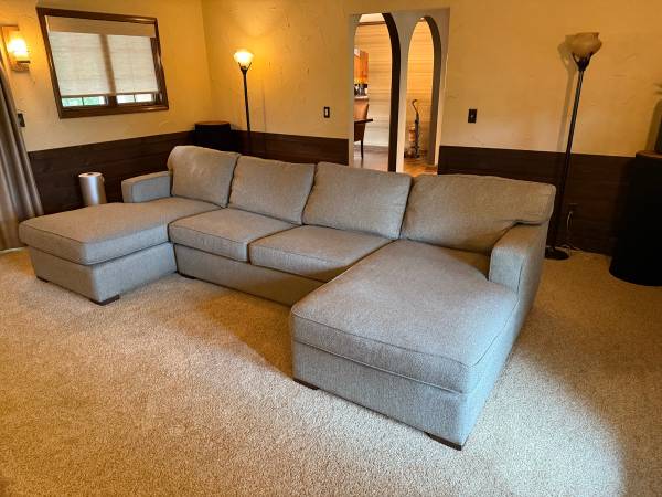 132” x 83” Excellent condition. No stains. Sectional with R and L side chaise Feather cushion fill.