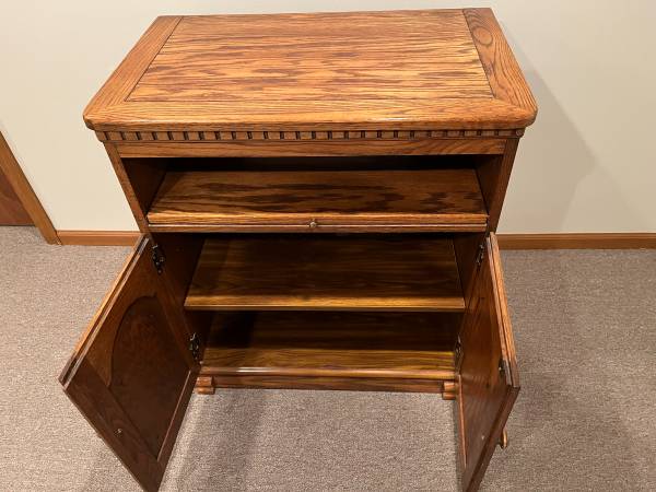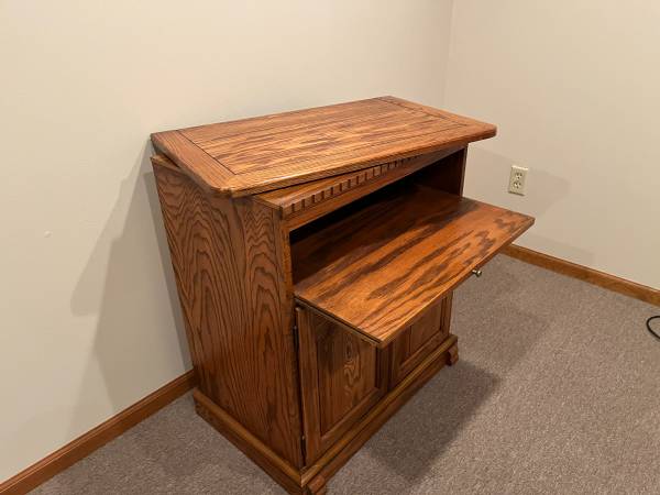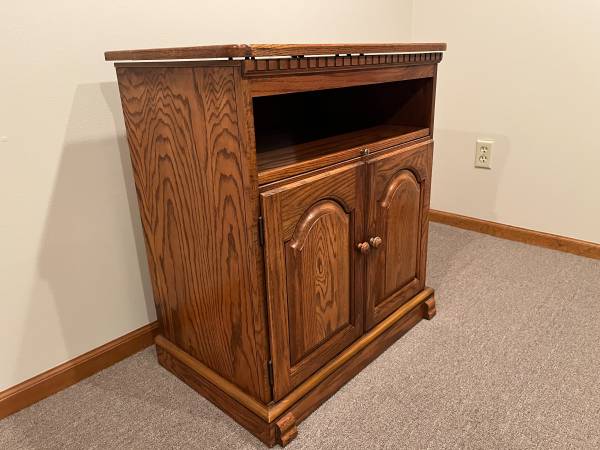 Oak Finish TV Stand Swivel Top Roll-Out Shelf Storage Below With Adjustable Shelf And Double Doors Four Swivel Casters