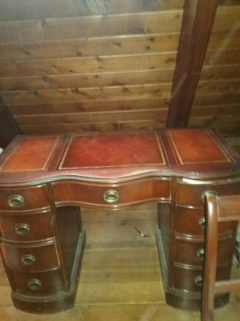 This antique desk is in great condition. Desk measures 42" wide, 21" deep, and 29.5" high. Unique design with curved center and many drawers. All the drawers open. Leather top has gold design. All original brass hardware and stain so it has never been redone. Add to this a matching harp chair which alone is worth a few hundred dollars. Will look beautiful in your home. Cash only. An easy drive just one turn off of highway 67 in Waukesha County. You will need 2 people to move it down an upstairs staircase. You are responsible for moving it. All the drawers can be taken out so it's easier to move. E-mail, text, or call show contact info