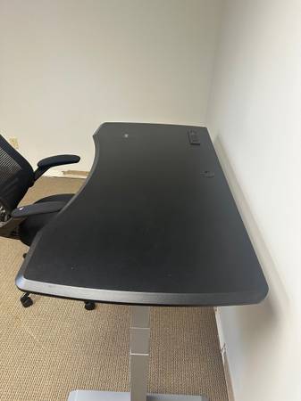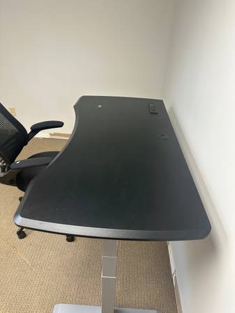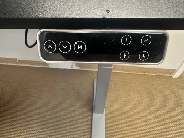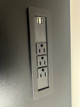 Stand up desk with 3 outlets and computer and cellphone charging outlets.