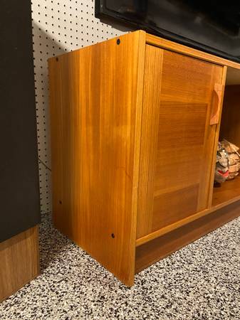 Fully finished on all sides with open back allows for plenty of space for cords, quick access to components and fresh air to keep everything running cool. Left side has a door with a solid teak pull and shelf for concealed storage, right side has vertical dividers for albums or books. Length is capable of accommodating a decent sized TV, whether wall-mounted or resting on the top, the low profile of the cabinet creates a clean minimalist look