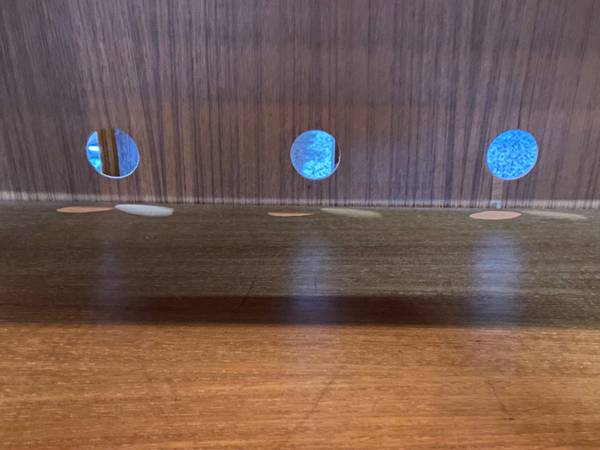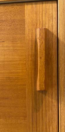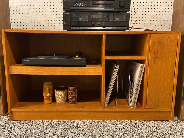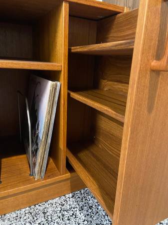 Pull out turntable shelf positioned next to a bank of 12″ LP vertical dividers. Three large pre-drilled holes for electronics cords Additional open storage space above and below for decor. Solid teak handle on slide-out drawer to the right with two shelves for your CDs, DVDs etc.