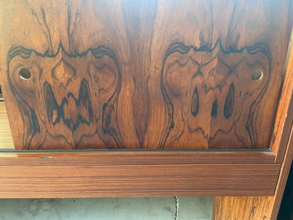 Rare offering. Versatile vintage wall unit. Made in Sweden, comes in three sections and is cleverly designed so that one overlapping section can slide out to increase the length of the unit. Upper hutch top section has sliding doors and rests atop, no clamps or brackets, but highly suggest some if using. Has two double sided drawers that can be opened from the front or back and has adjustable shelves and space for storing LP vinyl records. Can be positioned at a right angle as a corner shaped unit. Crazy gorgeous rosewood grain patterns throughout. All sides nicely finished so this can be used as a free standing desk / room divider in any home or office. We've never used these pieces, found to be too large for our space. Swedish Svegards rosewood chair available as well for additional $250. First five images from online, this has been in storage for years