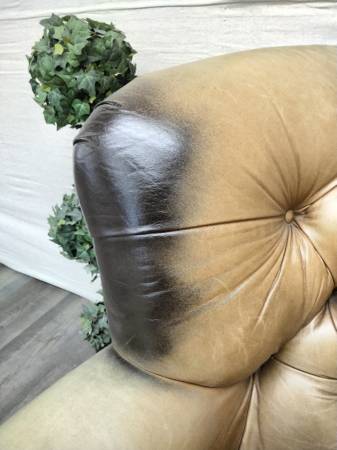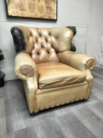 This chair has moderate use and is in very good condition. There are no rips, tears or stains and it comes from a smoke free/pet free home. The structure is fully in-tact and the cushion integrity is 100%. It is built very well, sturdy, comfortable and robust! The previous owner started to dye this chair dark brown but decided to buy something else. It can easily be finished. This chair is definitely priced accordingly. Feel free to check used pricing online.