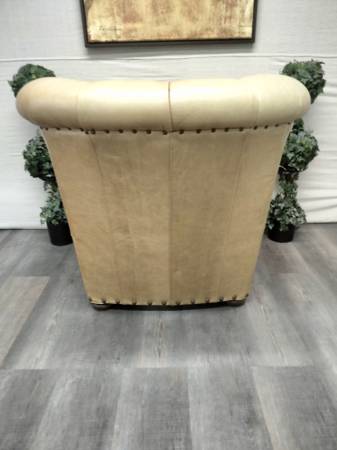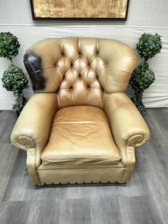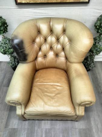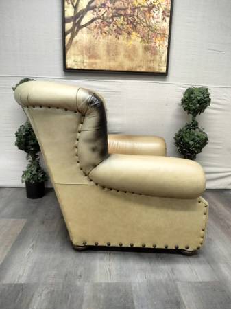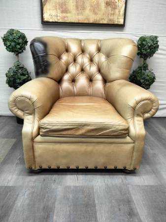 Elegant & timeless design, this beautifully crafted Restoration Hardware Churchill Classic is perfect for adding a touch of sophistication to any space. This chair features down-filled seat cushion, solid birch wood frame, tufted leather with nail head details. A camel color with a modern, rustic, luxe aesthetic that can be dyed with ease. This is timeless, heirloom quality.