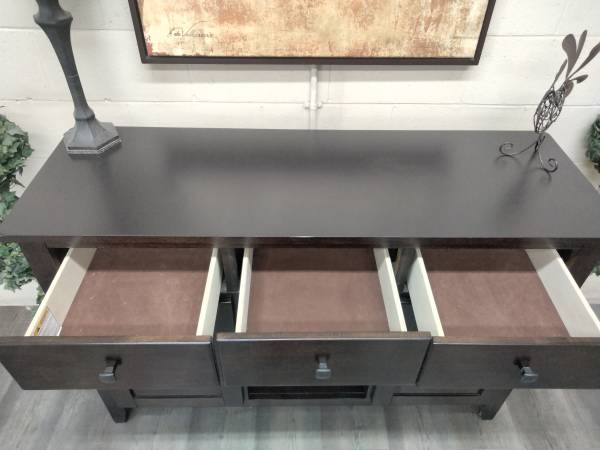 This cabinet has average use and is in very good condition and works perfectly! Everything works exactly like it should and it has a nice look to it. The drawers slide smoothly, doors open as they should and all hardware is original. It comes from a smoke free/pet free home and has no major scratches, dents or discoloration.