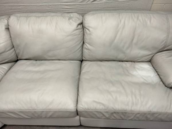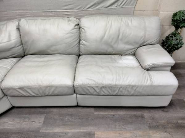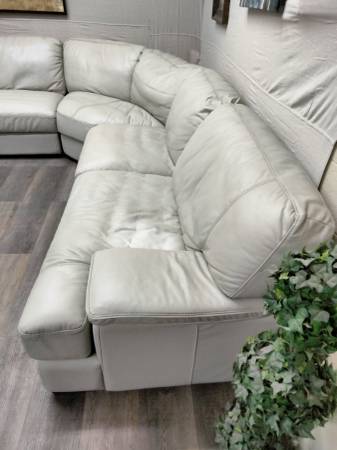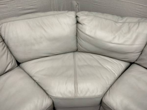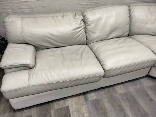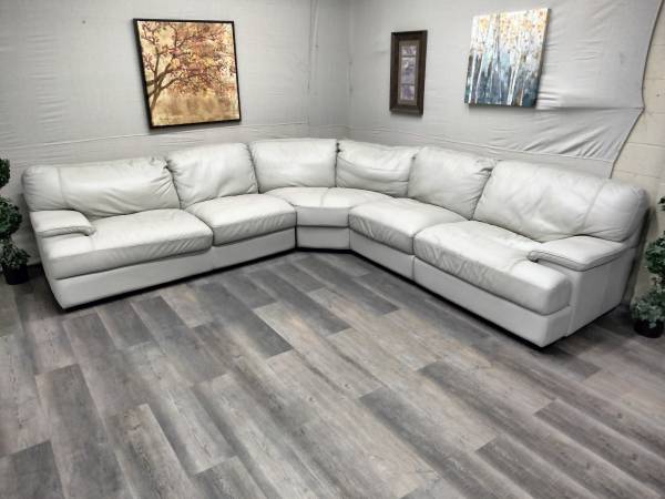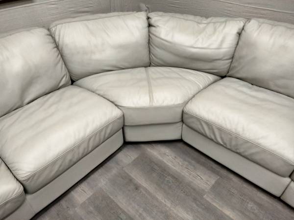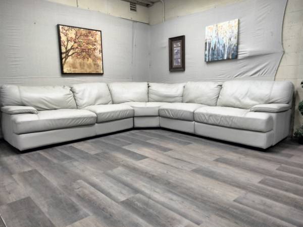 This is a Genuine Leather, Cream, Feather Filled, five seater sectional from Superb Creations. The Sectional is four pieces and has seating for five. The seat cushions are medium firm and the back cushions are nice and plush! Neutral color that works in any setting with nice supple leather. Very easy to keep clean and maintain! Seat cushions are removable and unzip if needed. Back cushions are attached and unzip at the bottom. It has large wood feet and large arms making it very sturdy. This set is very comfortable, perfect for lounging, napping or hosting guests! Delivery and assembly is included in the price!