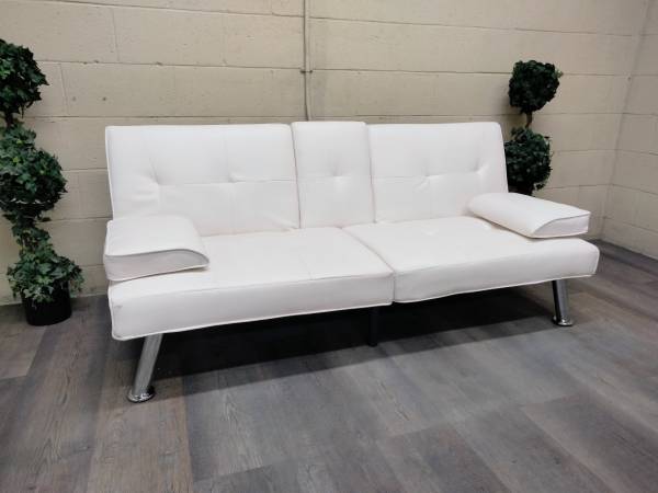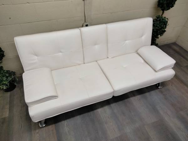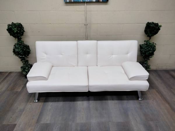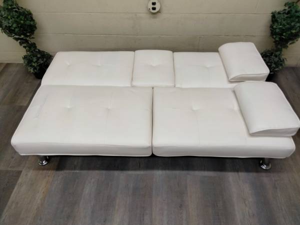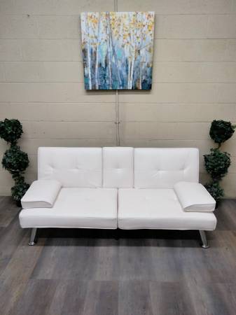 This is a contemporary, Alabaster White, Petite Futon Couch. Dimensions and Condition are below. Seats two people comfortably and has a very modern look to it. If you're looking for a nice futon at a reasonable price this is definitely worth looking at. It is very comfortable as a couch and as a sleeper. Neutral color that works in any space. Perfect for an apt, studio, office, breezeway, indoor porch or for overnight company.