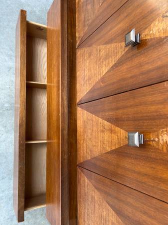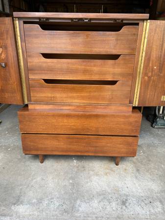 Mid Century Modern highboy dresser with 2 doors on piano hinges concealing 3 drawers with 2 drawers below.