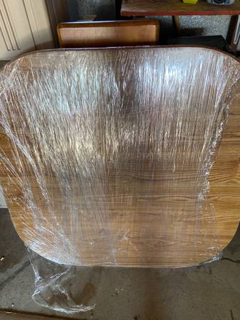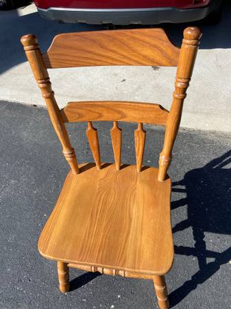 Oak finish dining table with 2 leafs. 42” x 42”, expands to 42” x 66”. 4 chairs.