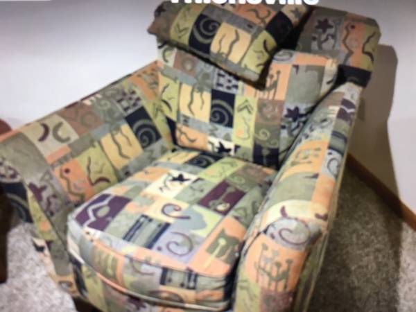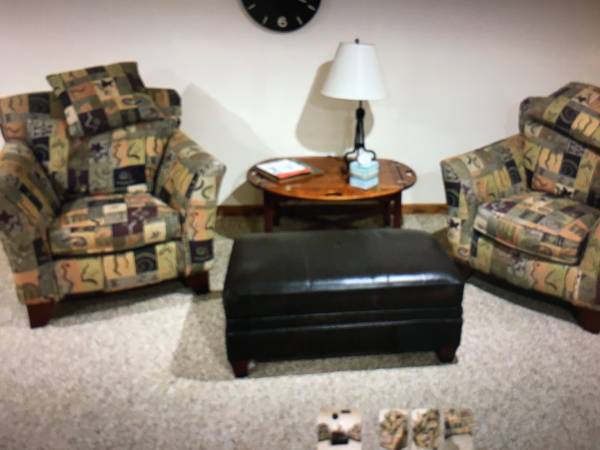 Nice used large living room 2 chairs and 1 matching ottoman. 90 bucks for all come on. Cloth modern pattern w/ cushions and pillows. Call 4 one 4 429-1119.