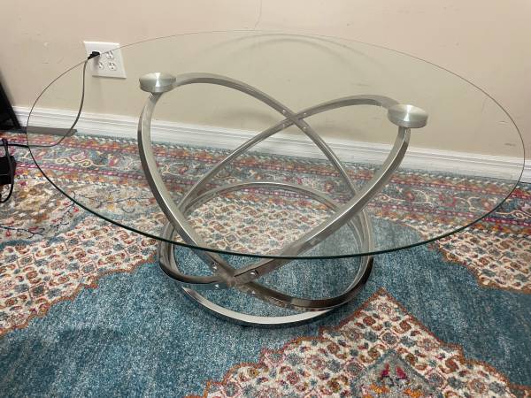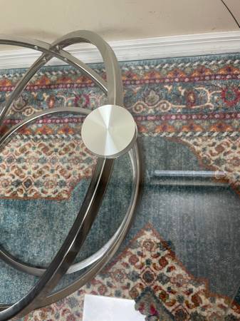 3 Ft 2”W Ashley Signature furniture Glass top coffee table Chrome geometric base 38"W x 17.5"H. Good Clean Condition, some light cosmetic scratches. Smoke-Free. Delivery 🚚 Extra. Habla Espanol Mesa de centro moderna de cristal con tablero de cristal templado y acabado cromado.