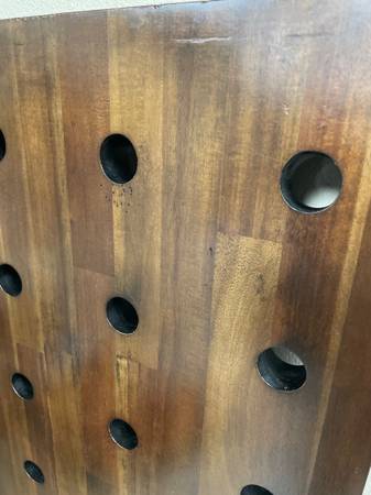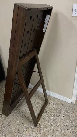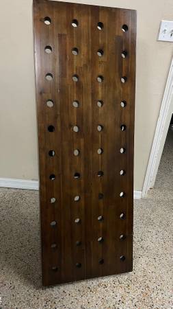 44 Bottle Wine 🍷 French Riddling Rack 21” W x 57.5” Tall x 4” Thick. Hinged A Frame, Rustic industrial decor look. Used with Champagne or Sparkling Wine making for collecting sediment in the bottle neck during fermentation. 100 % solid wood, Made in Vietnam. Riddling process of periodically rotating a bottle a quarter of a turn while simultaneously upside down. This movement causes sediment accumulating inside the bottle to slide down to the neck.