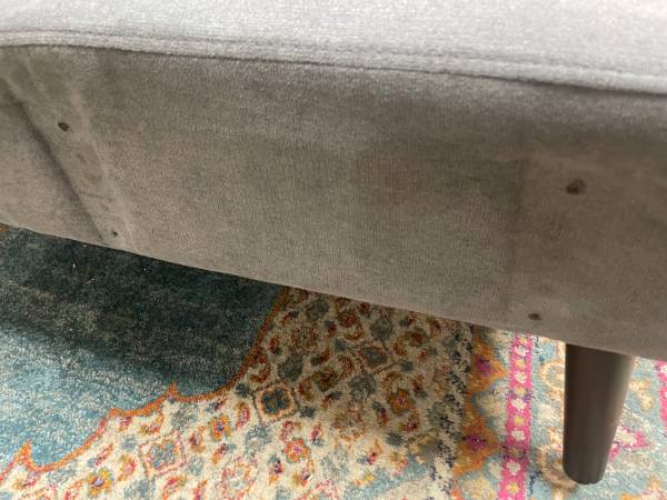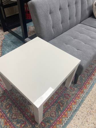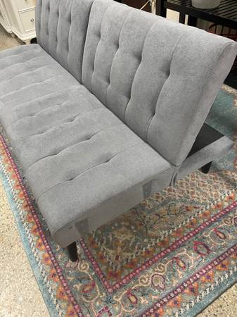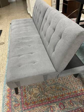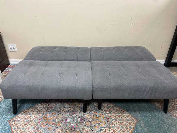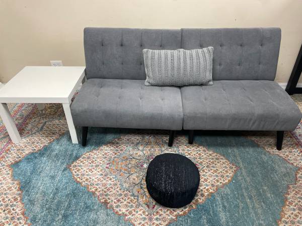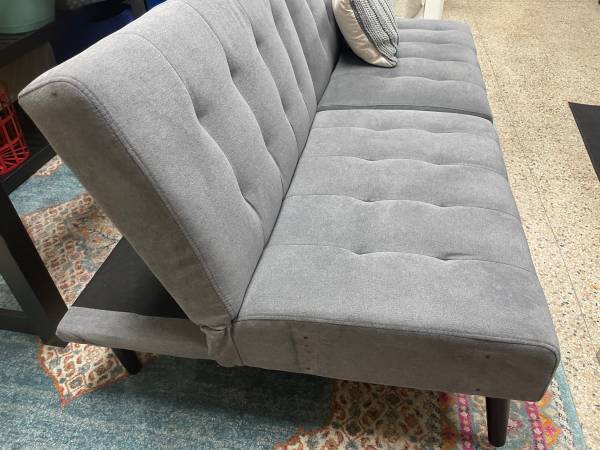 Futon Sofa Couch fold down into Bed. 66” W x 40 D x 31” Seat H. Good Clean Condition. Smoke-free. Does not have side arms just as in the photo, has imprint in material where arm was. Pillow, foot ottoman & white side table included if you want. Delivery 🚚 extra. Habla Espanol. Sofá gris, futón También tengo servicio a domicilio.