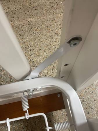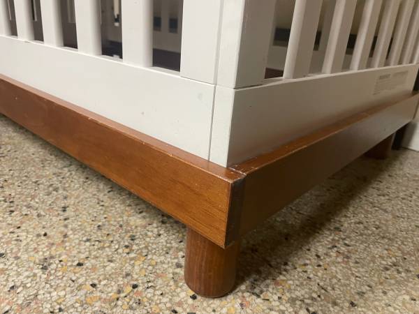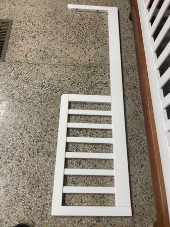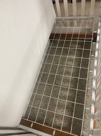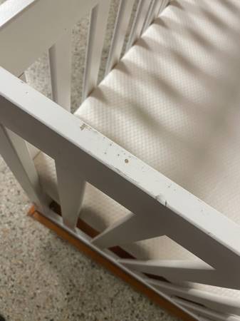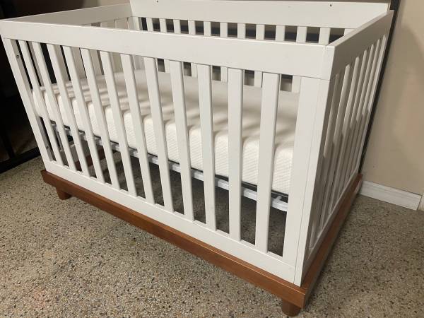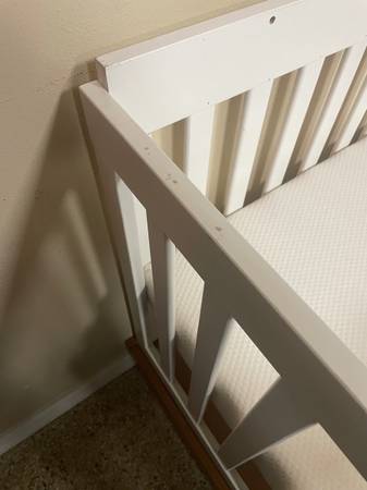 White Baby Crib, 3 adjustable heights, included mattress zip off washable cover. Edge of top frame has some minor Knicks. Good clean Condition. Smoke-free. Has a railing piece to convert to a...