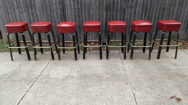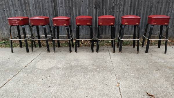 7 Red Dive Bar Stools for sale. Solid, heavy Duty. Fair condition, $10 each, or $50 for all 7,Or Best Offer. Call or Text Best. (four,I,four)-two,I,O-O,I,six,3. Thanks.