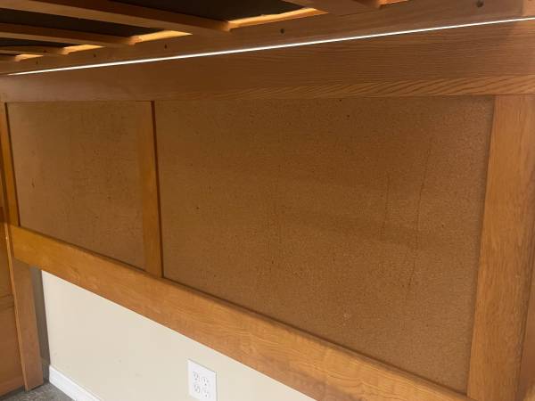 Full Double Wood Loft Bed Frame with ladder, platform slats, Bunkie Board Included. Underneath has a large corkboard. On side has entrance for the Ladder in the photo itβs shown in a different...