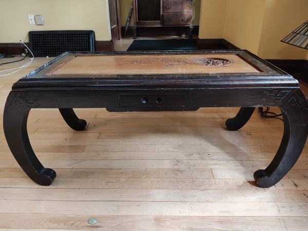 Hand carved Oriental Coffee Table with glass cover. Heavy hardwood. Unknown origin. Has a little drawer. 1/4" glass top. Some minor wear on the dark wood. The lighter carved area under the glass is perfect, maybe a little dusty. $20.