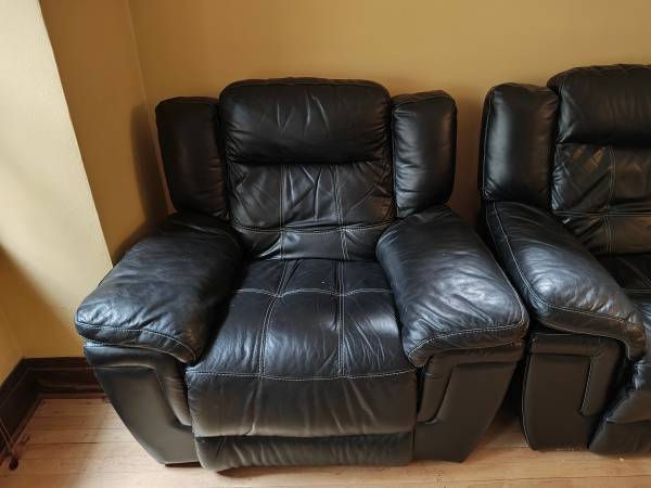 Black leather recliner, 46"x41" $50. No tears or damage.