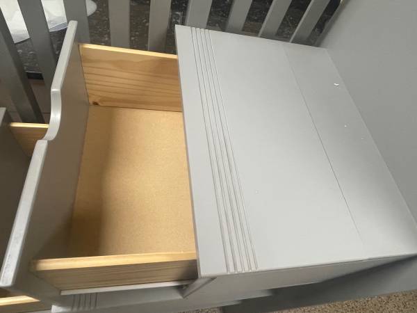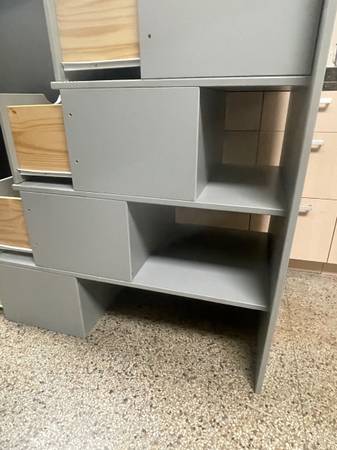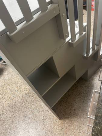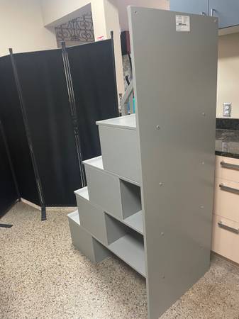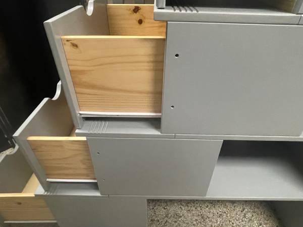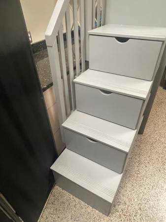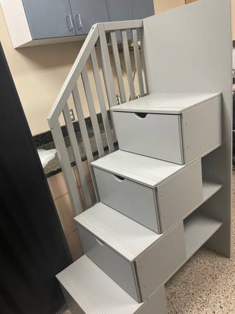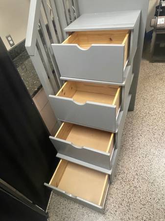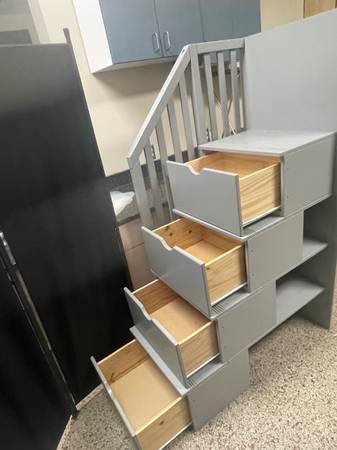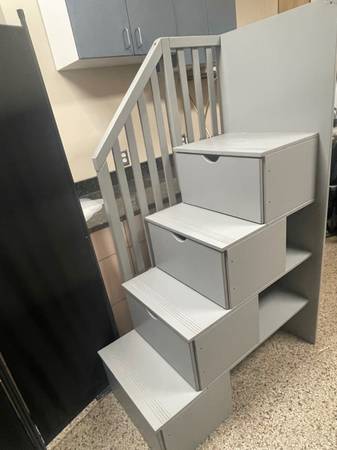 Gray Wood Dresser staircase for a bunkbed or loft bed stairs with 4 built in drawers and bookcase shelf sides. Very Strong and Sturdy. Good Condition. Top step is 47” x 25 1/4”W x 66” H x stair treads are 21” W x riser are 11 3/4” H x total depth 42”. Delivery 🚚 extra. Habla Espanol. También tengo servicio a domicilio.