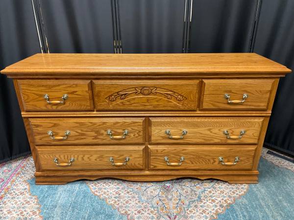 Large 7-drawer Bedroom Chest Dresser. 66”W x 35”H x 17.5”D. Good Clean Condition. All Drawers open fine. Non-smoking. Heavy duty American heirloom Furniture. Delivery 🚚 Extra 1st floor only or with elevator. This is not going to fit in all stairs if a turn or lower ceiling. Habla Espanol, Cómoda grande de madera, con siete cajones. También tengo servicio de entrega a domicilio.